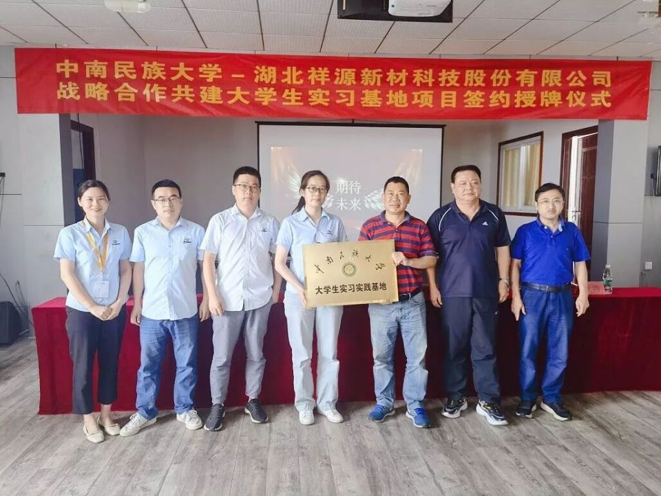 2021年7月19日,正值盛夏、在這神清氣爽的美好時節,我們心懷美好的祝愿,在公司活動室隆重舉辦了中南民族大學-湖北祥源新材科技股份有限公司戰略合作共建大學生實習基地項目簽約授牌儀式。出席儀式的領導有中南民族大學化學與材料學院:鄧書記、郭書記、張老師及公司各部門領導代表。